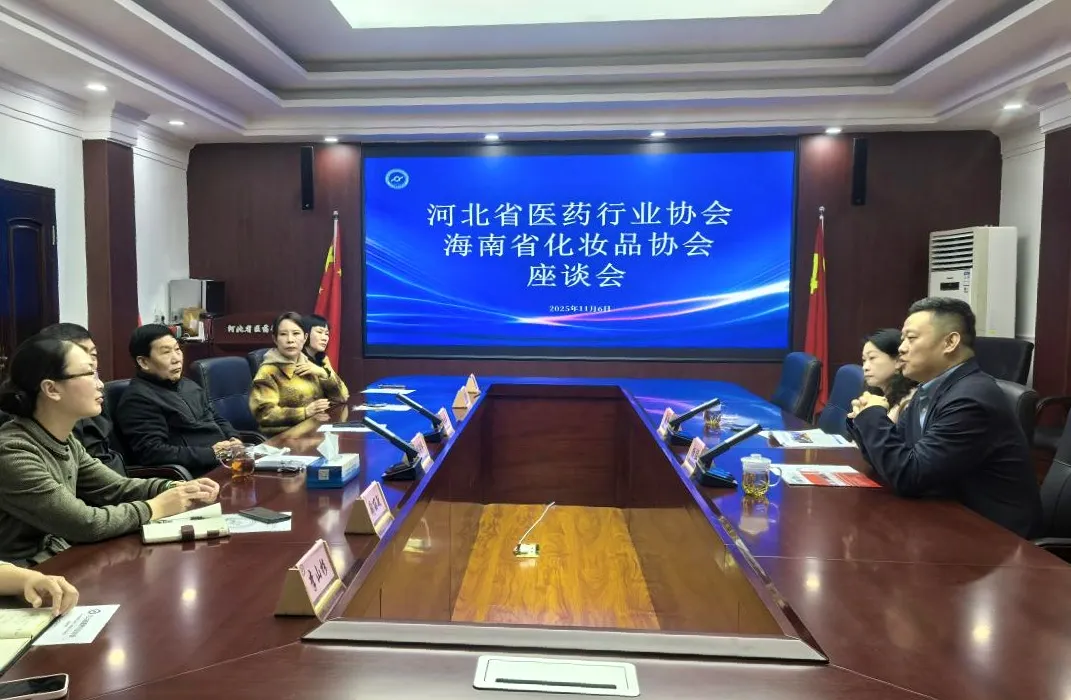 2025年11月6日,海南省化妆品协会杨猛会长一行到访河北省医药行业协会,协会书记刘骁悍出席座谈会。海南省化妆品协会吴燕主任、河北省医药行业协会副书记智建国、副会长陶丽敏、副会长兼秘书长毛谕明等参会,双方围绕“资源互补、协同发展”主题开展座谈交流,共话两地产业合作新机遇。刘骁悍书记介绍了协会基本情况,他表示,协会自成立以来,始终秉承“服务党