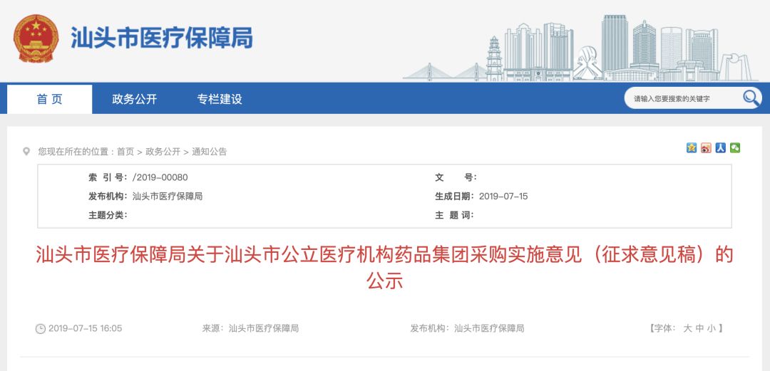 昨日(7月15日),汕头市医保局发布文件《关于汕头市公立医疗机构药品集团采购实施意见(征求意见稿)的公示》(以下简称《意见》)。