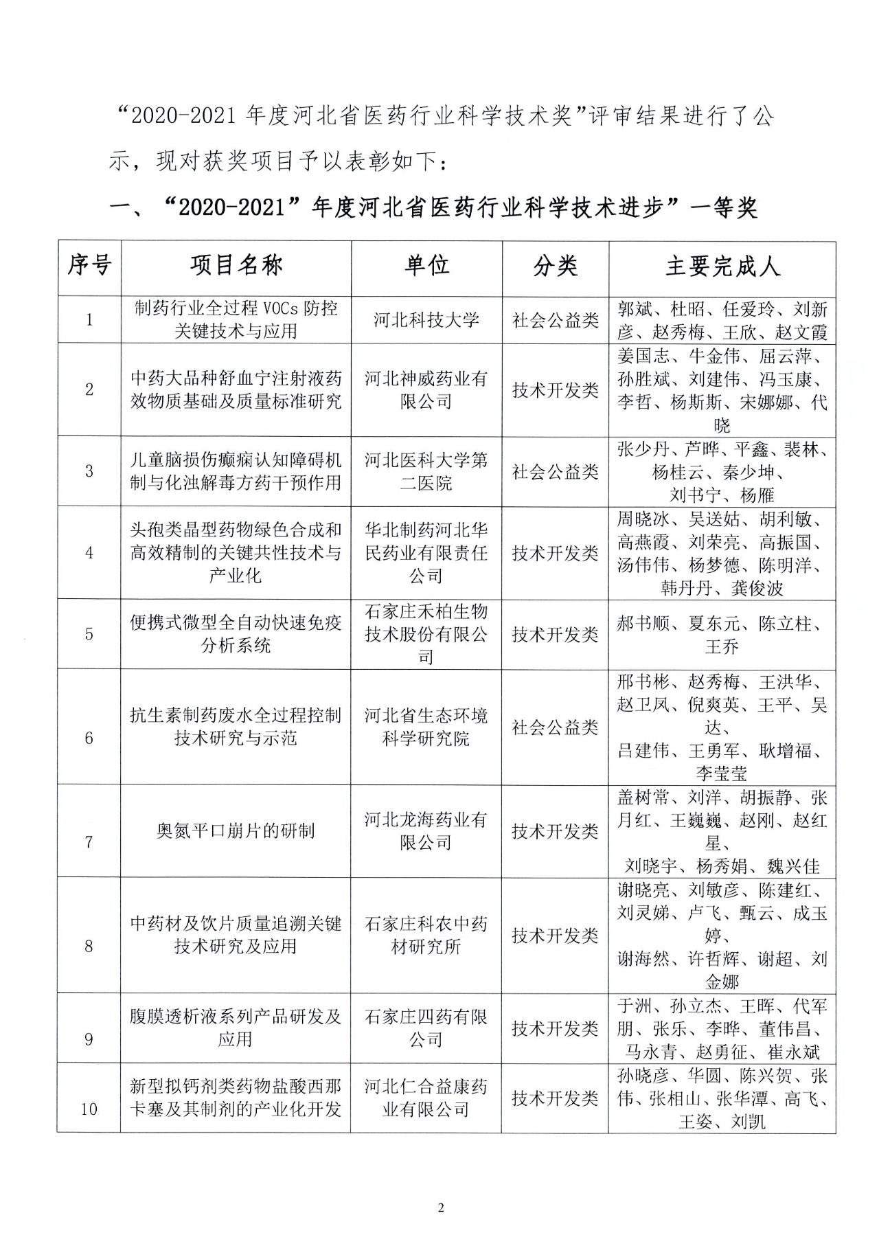 关于表彰荣获“2020-2021年度河北省医药行业科学技术奖”的决定
